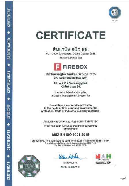 A Fire Box Kft. 2003 év óta rendelkezik ISO 9001-es minőségirányítási rendszer tanúsítvánnyal, amely elengedhetetlen feltétele ma már egy minőségi szolgáltatás biztosításához a munkavédelmi, tűzvédelmi, környezetvédelmi szakterületen. Ezt több száz elégedett partterünk egyöntetű véleménye is tanúsítja.